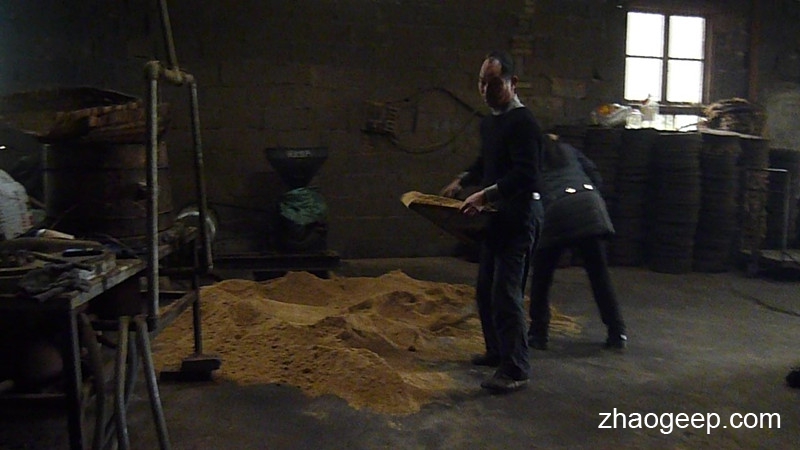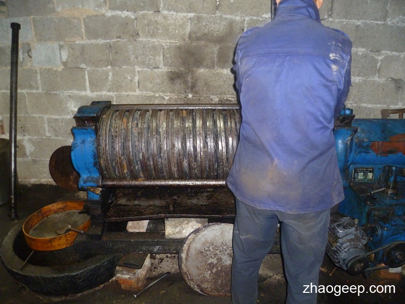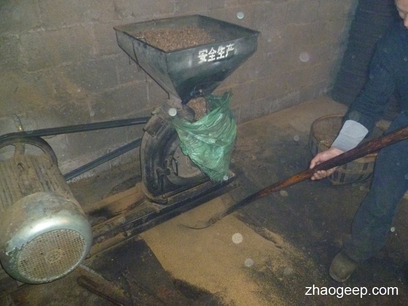 茶籽烘干后就開始磨粉了。烘干要確保水分在10%以內(nèi),但也不能太低。原則上8%-10%之間。一般臥式炕烘干400斤茶籽大約3個小時左右。