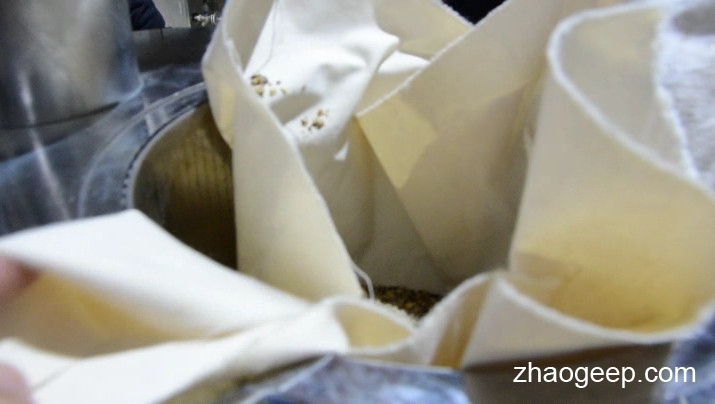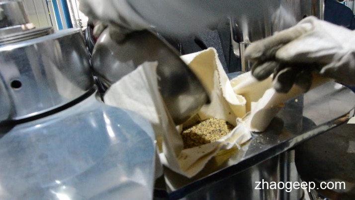 將烘干后的核桃仁用濾布包覆做餅或裝入濾布縫制的袋子內(nèi)。
