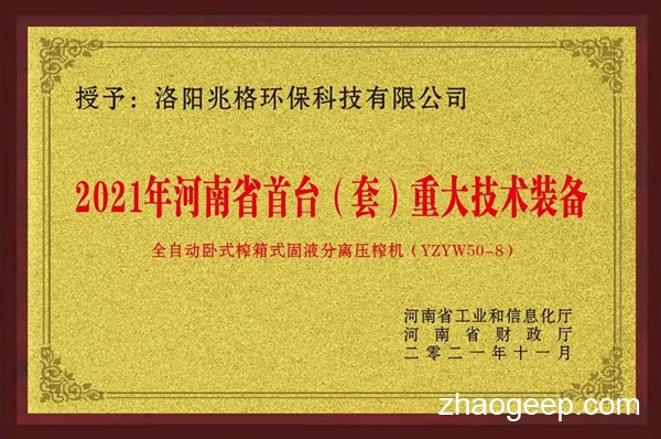 熱烈祝賀兆格環(huán)保自主研發(fā)的全自動臥式榨箱式固液分離壓榨機(型號YZYW50-8)榮獲“2021年河南省首臺(套)重大技術(shù)裝備”認定